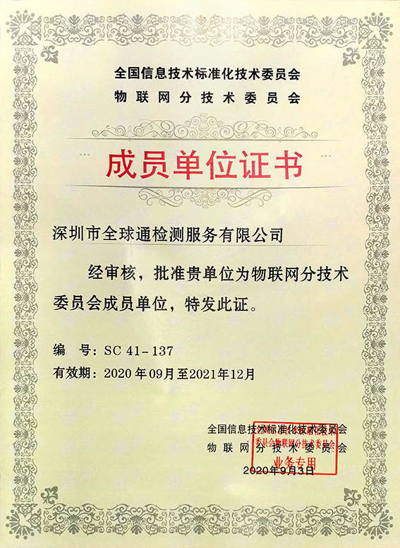 2020年,物聯(lián)網(wǎng)分技術(shù)委會向深圳市全球通檢測服務(wù)有限公司頒發(fā)成員單位證書,全球通檢測正式成為物聯(lián)網(wǎng)分技術(shù)委員會成員單位。